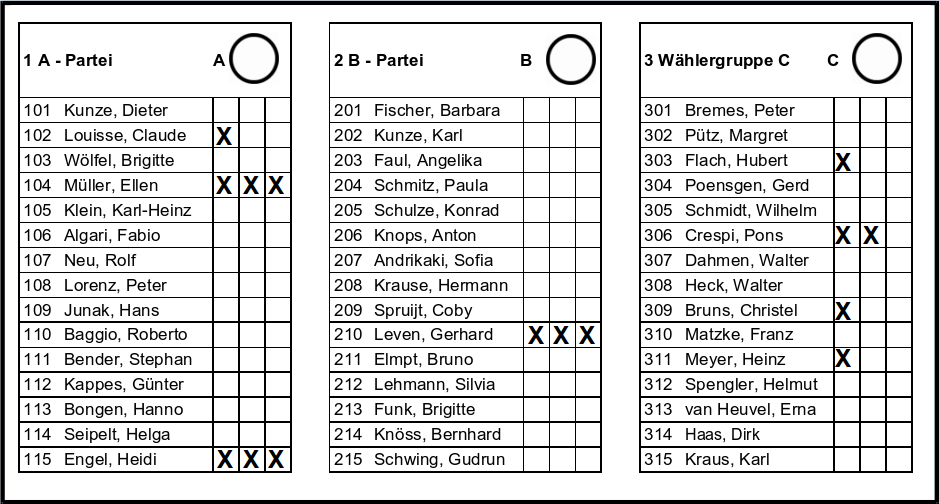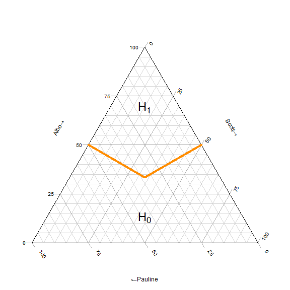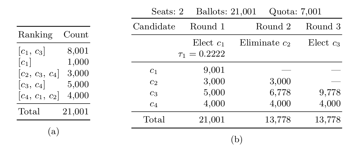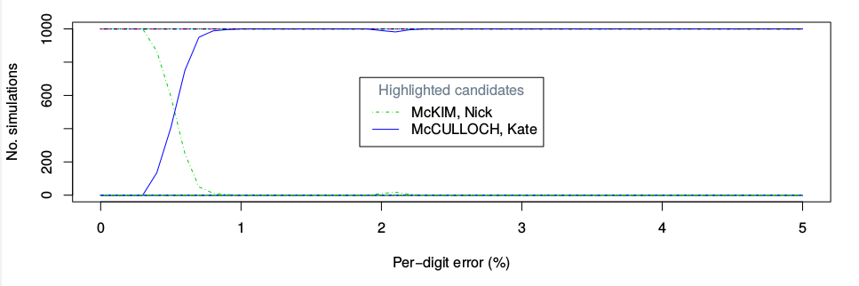 class: center, middle, inverse, title-slide # Elections…Trust?…Verify! ## Statistical audits of election results ### Damjan Vukcevic ### SSA Vic / University of Melbourne public lecture ### 30 March 2022 --- # Collaborators ## USA - Ron Rivest - Philip Stark ## Melbourne - Michelle Blom - Peter Stuckey - Vanessa Teague ## Students - Floyd Everest - Calvin Huang --- # Overview 1. Why? 2. How? 3. More complex elections 4. Australian elections --- class: inverse, center, middle # Why audit? --- # Elections - Foundational for democracy - Can be challenging to run effectively -- ## Elections in Australia - Inclusive - Efficiently run - Highly trusted (...relatively speaking) --- # Two key ingredients 1. Paper ballots 2. Scrutineering -- Old fashioned? Inefficient? -- Pressure to: - Automate, speed up, reduce costs - Replace people with computers --- # USA horror stories [Serious Error in Diebold Voting Software Caused Lost Ballots in California County](https://www.wired.com/2008/12/unique-election/) (2008) [Wisconsin Election Surprise: David Prosser Gains 7,500 Votes After ‘Human Error’ In Waukesha County](https://www.huffingtonpost.com.au/2011/04/07/david-prosser-wisconsin-supreme-court_n_846431.html) (2011) [Russians hacked 2 Florida voting systems](https://www.politico.com/states/florida/story/2019/05/14/russians-hacked-2-florida-voting-systems-fbi-and-desantis-refuse-to-release-details-1015772) (2019) -- ## Move to electronic systems Rapid computerisation of elections since 2000 presidential election ('hanging chads') Abandoned many previous verification processes --- # NSW iVote failures iVote: electronic voting system used in NSW -- NSW local council elections, Nov/Dec 2021: - System went down for several hours - Many voters were unable to vote -- Also previously: * Encryption flaws discovered by Vanessa and colleagues (Thomas Haines, Sarah Jamie Lewis, Olivier Pereira) --- # Australian Senate elections Ballot papers are handled electronically (for some parts of the process): - Scanned - Digitised - Counted (digitally) -- What could go wrong? -- - Machines are proprietary and closed-source - Scanning and counting not fully open to scrutiny(?) --- # Don't trust your scanner [Xerox bug](https://www.dkriesel.com/en/blog/2013/0802_xerox-workcentres_are_switching_written_numbers_when_scanning): .pull-left[ .center[  ] ] .pull-right[ .center[  ] ] -- Other examples: - Hole-punch filling - Image manipulation attacks -- In the Appendix: - Senate errors experiment --- # Recommendations and changes Jan 2018: Australian National Audit Office [recommended a 'statistically valid audit'](https://www.anao.gov.au/work/performance-audit/aec-procurement-services-conduct-2016-federal-election) -- Nov 2021: New legislation passed (Assurance of Senate Counting), requiring: * A statistical check of the accuracy of the digital data * Not a 'full' audit (more details at the end) --- # Reasons to conduct an audit Detect inadvertent errors Detect deliberate manipulation Increase confidence in reported result Increase **trust** in our electoral processes --- class: inverse, center, middle # Introduction to election audits --- # Types of audits * Process/compliance audits * Results audits -- - **Ballot-polling** audits - Comparison audits - Hybrid audits --- # Ballot-polling audits Like a standard poll We 'survey' the ballots -- We need: * A trustworthy paper trail (i.e. paper ballots) * A list/record of all ballots * Ability to retrieve specific ballots -- Typically sample **without** replacement ...but can approximate by assuming sampling with replacement --- class: clear, center, middle .font180[Let's do it...] --- class: clear, center, middle  [Alice and Bob 'retired'](https://www.telegraph.co.uk/news/2021/09/04/woke-wars-edinburghs-computer-scientists-banned-using-alice/) --- class: clear, center, middle .font180[Let's do it...] Albo vs Scott --- # Inference for sample proportion True vote proportion for a particular candidate (reported winner): `$$p = \Pr(X = \text{Albo})$$` Sample (assume iid, and no invalid votes): `$$X_1, X_2, \ldots, X_n \in \{\text{Albo}, \text{Scott}\}$$` -- Sample tally: `$$Y = \text{votes for Albo} = \sum_{i=1}^j \mathrm{1}(X_i = \text{Albo})$$` -- Sample proportion: `$$\hat{p} = \frac{Y}{n}$$` -- Sampling distribution: `$$Y \sim \mathrm{Binomial}(n, p)$$` --- # Binomial distribution (n = 20) <!-- --> --- # Binomial distribution (n = 100) <!-- --> --- # Estimation Suppose we got `\(y = 13\)` out of `\(n = 20\)` sampled ballots. `$$\hat{p} = \frac{13}{20} = 0.65$$` -- `$$\text{95% confidence interval: } (0.41, 0.84)$$` -- What if we got `\(y = 65\)` out of `\(n = 100\)`? -- `$$\hat{p} = \frac{65}{100} = 0.65$$` `$$\text{95% confidence interval: } (0.55, 0.74)$$` --- # Traditional post-election audits Sample a **fixed** number (proportion) of ballots -- ## Example Californian law 1965: 1% of ballots to be checked by hand -- ...and what next? --- # Outcomes ## Possible decisions * 🏆 **Certify** the reported election result * ⌛ Request a **recount** of the votes -- ## Outcomes | | Certify | Recount | |----------------------------|:--------------------:|:--------------------:| | Reported result is wrong | 👎 | ✅ | | Reported result is correct | ✅ | 👎 | --- # Formalisation as a hypothesis test | | Reject `\(H_0\)` (certify) | Do not reject `\(H_0\)` (recount) | |----------------------------------------|:----------------------:|:-----------------------:| | `\(H_0\colon\)` Reported result is wrong | Type 1 error (👎) | ✅ | | `\(H_1\colon\)` Reported result is correct | ✅ | Type 2 error (👎) | -- In our example: `$$\begin{cases} H_0\colon p \leqslant 0.5, & \text{Albo did not win} \\ H_1\colon p > 0.5, & \text{Albo won} \end{cases}$$` -- Error rates: `$$\begin{cases} \alpha = \Pr(\text{Type 1 error}) = \text{Miscertification rate} \\ \beta = \Pr(\text{Type 2 error}) = \text{Unnecessary recount rate} \end{cases}$$` --- # Tradition is inefficient -- ## Landslide el